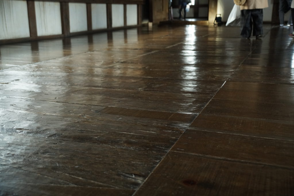 築城当時の板かもしれません。台カンナではなく手斧? 凸凹が今では珍しいです。左右のきれいに平らな北は昭和の修理の時の板と思われます。