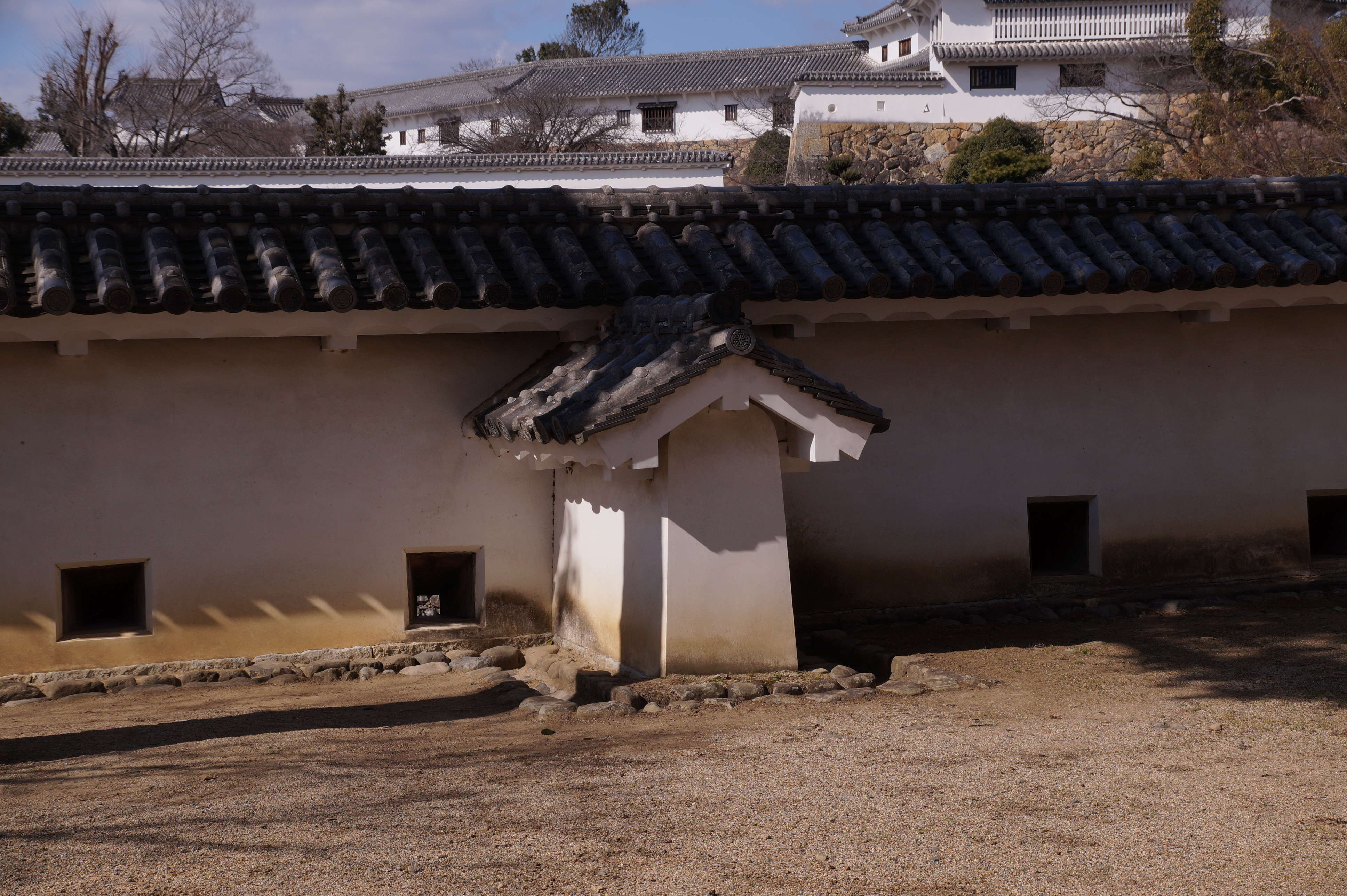 姫路城の土塀は、他の城とちがって土の塊だそうです。他の城は地面に穴をあけて掘っ立て柱で枠を作り厚い土塀を作るので、後ろに柱の支柱があるのでしょうが、姫路城は年度の粘土のブロックを置いて繋ぎの粘土でなじませ一体化し、整形したそうです。